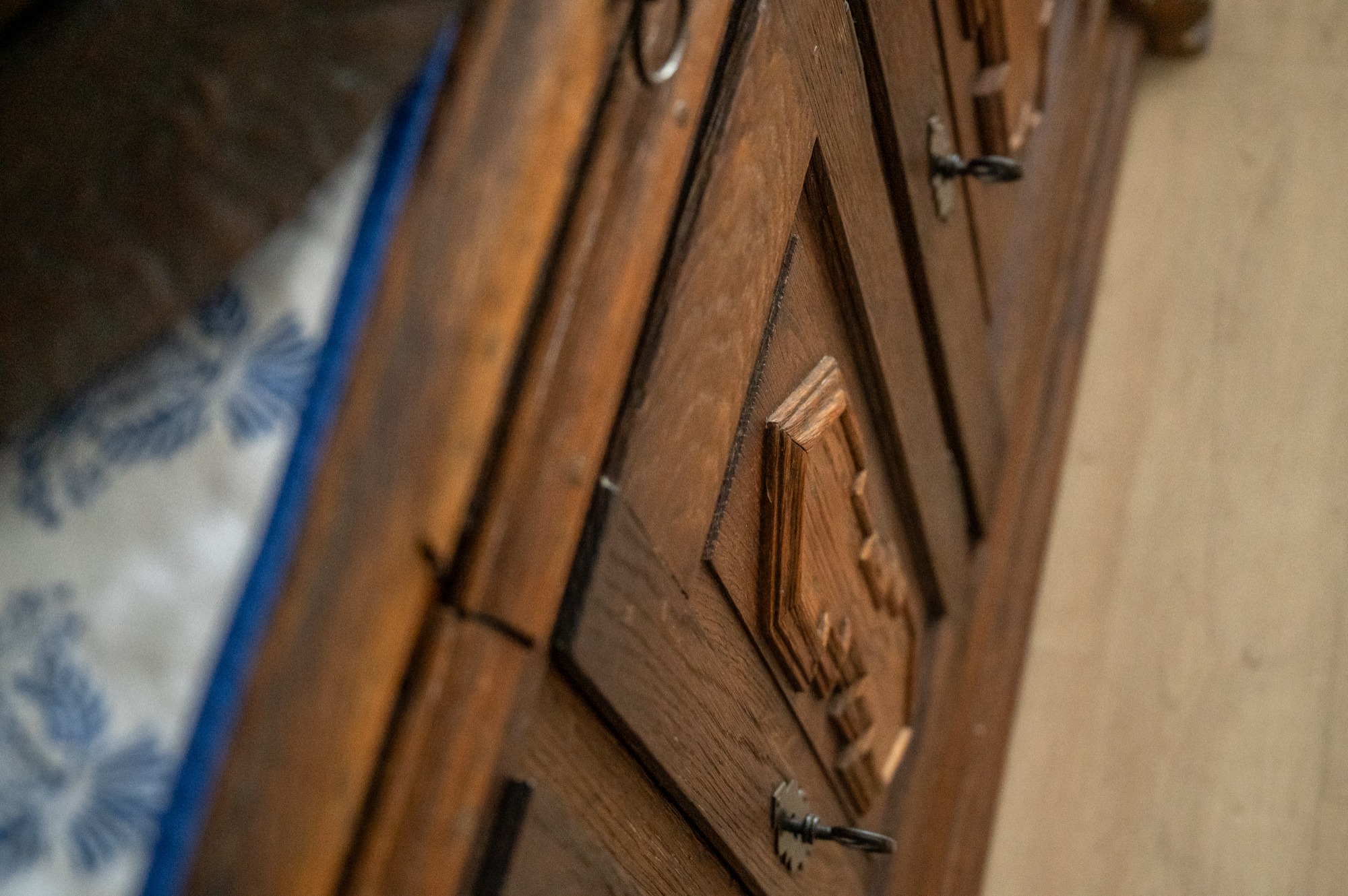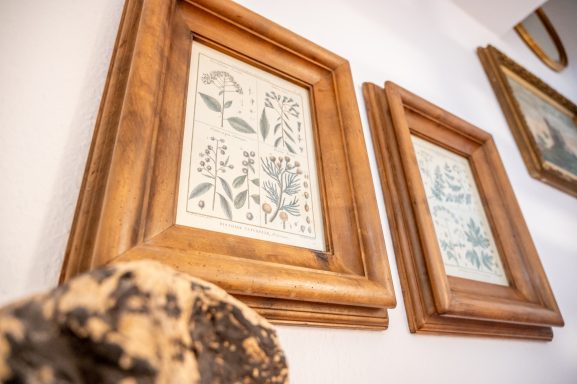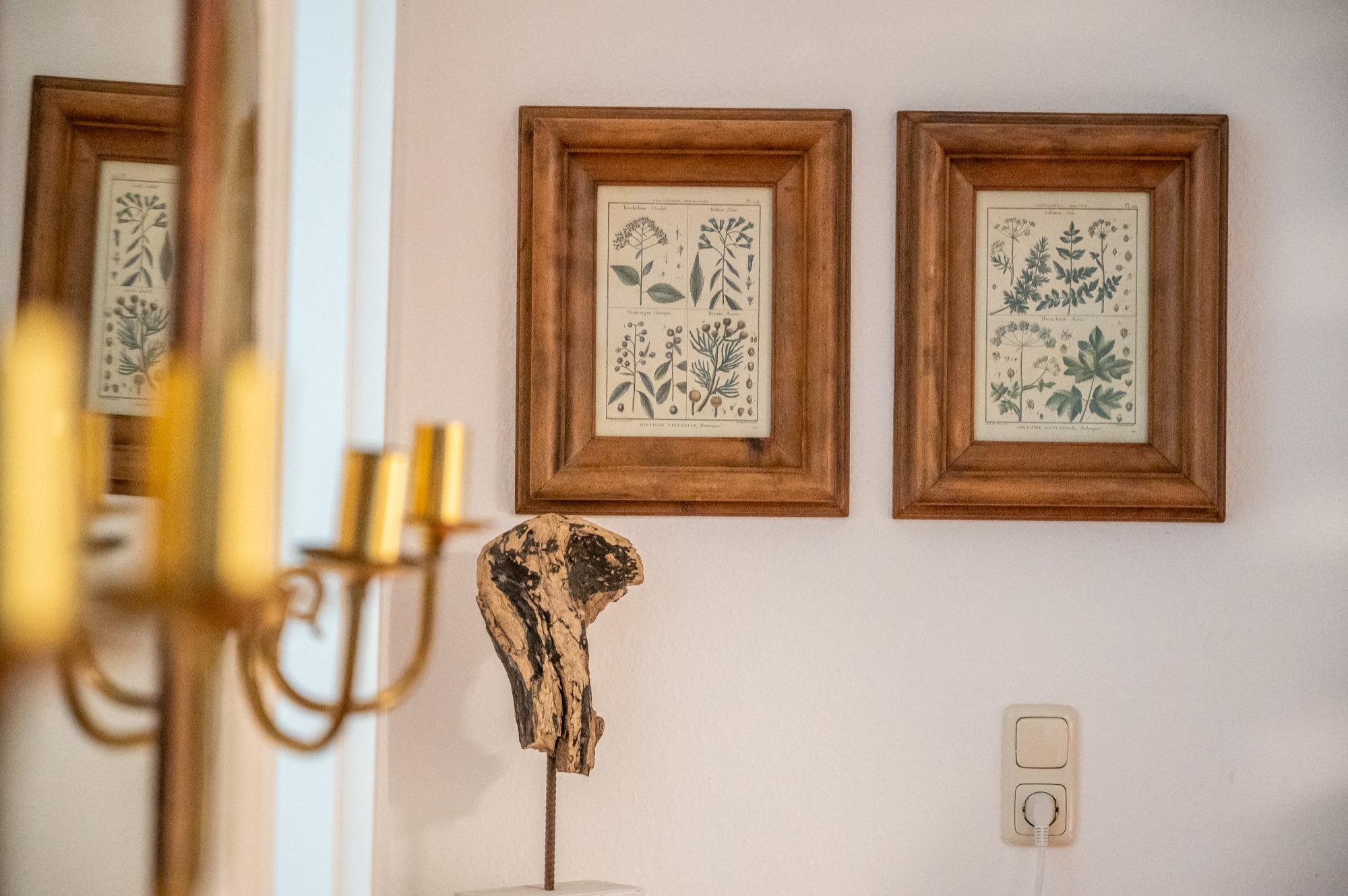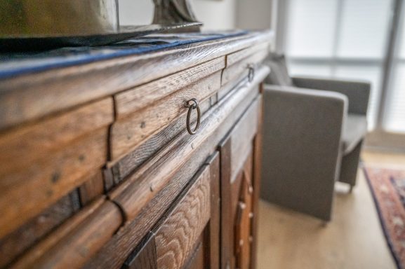 Ein Eichenschrank aus dem 18. Jahrhundert, eine historische Anrichte, eine Biedermeierkommode sowie ein Sekretär und Spiegel aus dem frühen 19. Jahrhundert erzählen von vergangener Handwerkskunst und schaffen ein Ambiente mit echter Persönlichkeit. Ergänzt wird dies durch besondere Details wie ein originales Sprossenfenster aus einem alten Bauernhaus sowie weitere ausgewählte Einzelstücke.