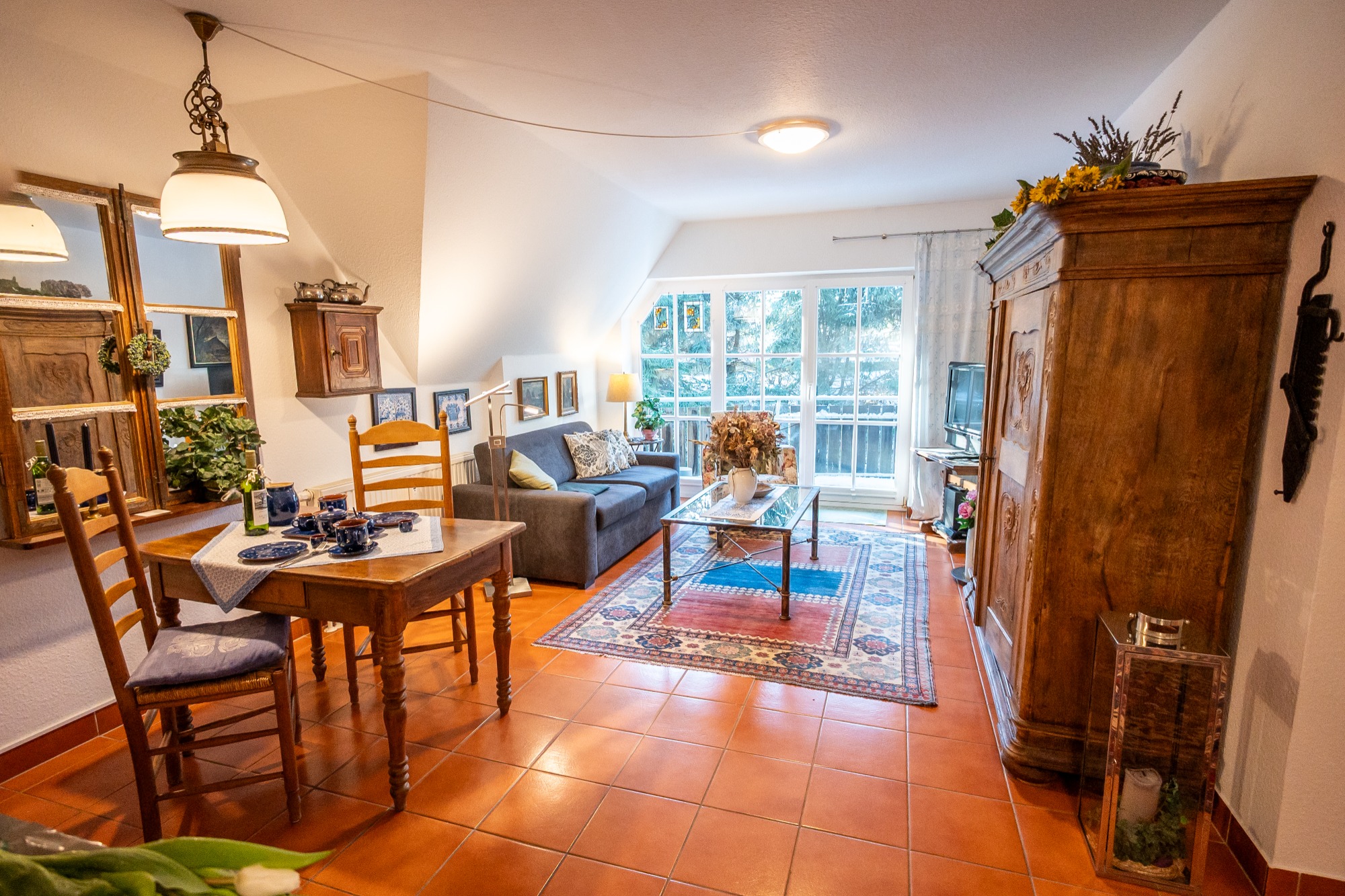 Die Klönstuv überzeugt durch eine außergewöhnlich stilvolle Einrichtung, die Geschichte und Wohnkomfort auf besondere Weise verbindet. Hochwertige Antiquitäten aus verschiedenen Epochen, ausgewählte Ölgemälde und liebevoll restaurierte Einzelstücke verleihen der Wohnung eine warme und individuelle Atmosphäre.