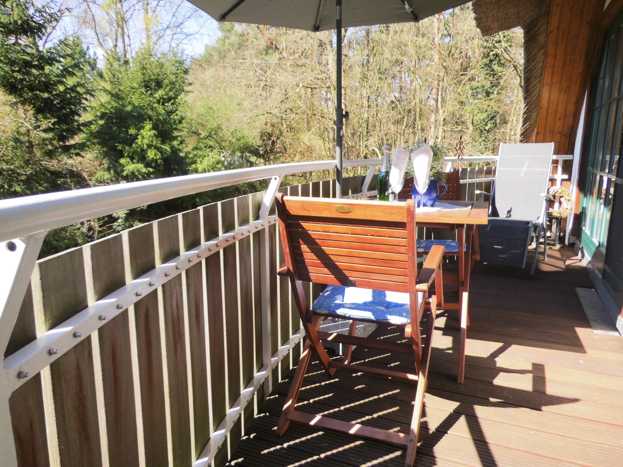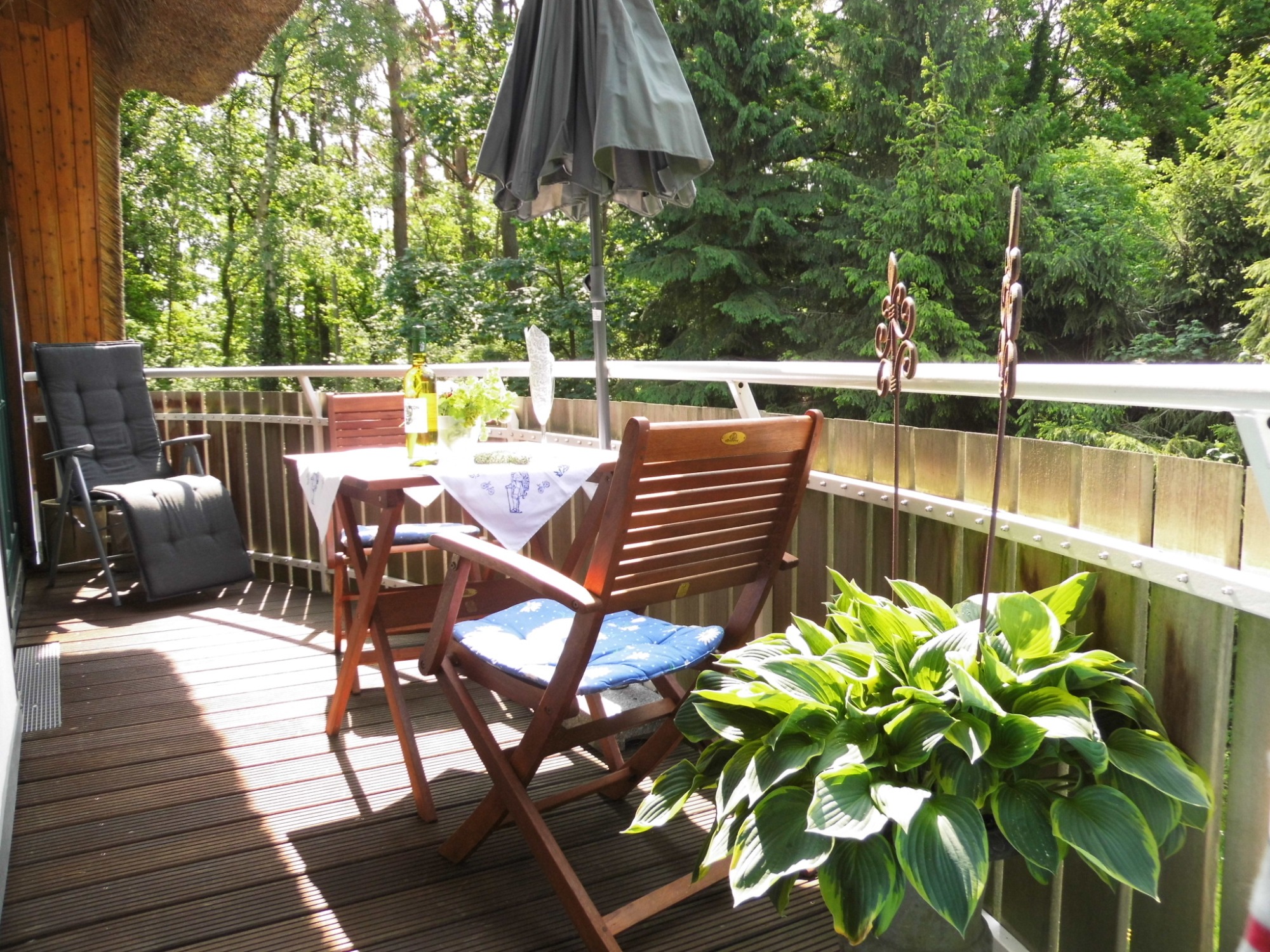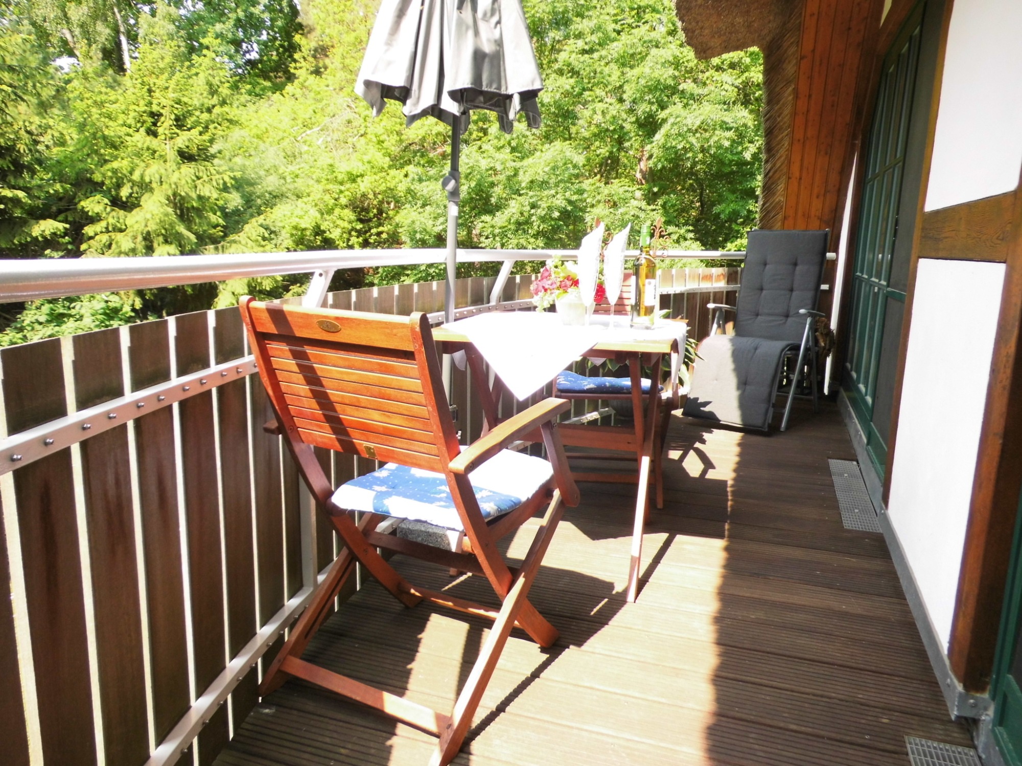 - Balkon mit Tisch, Stühlen, Relaxliegen und Sonnenschirm