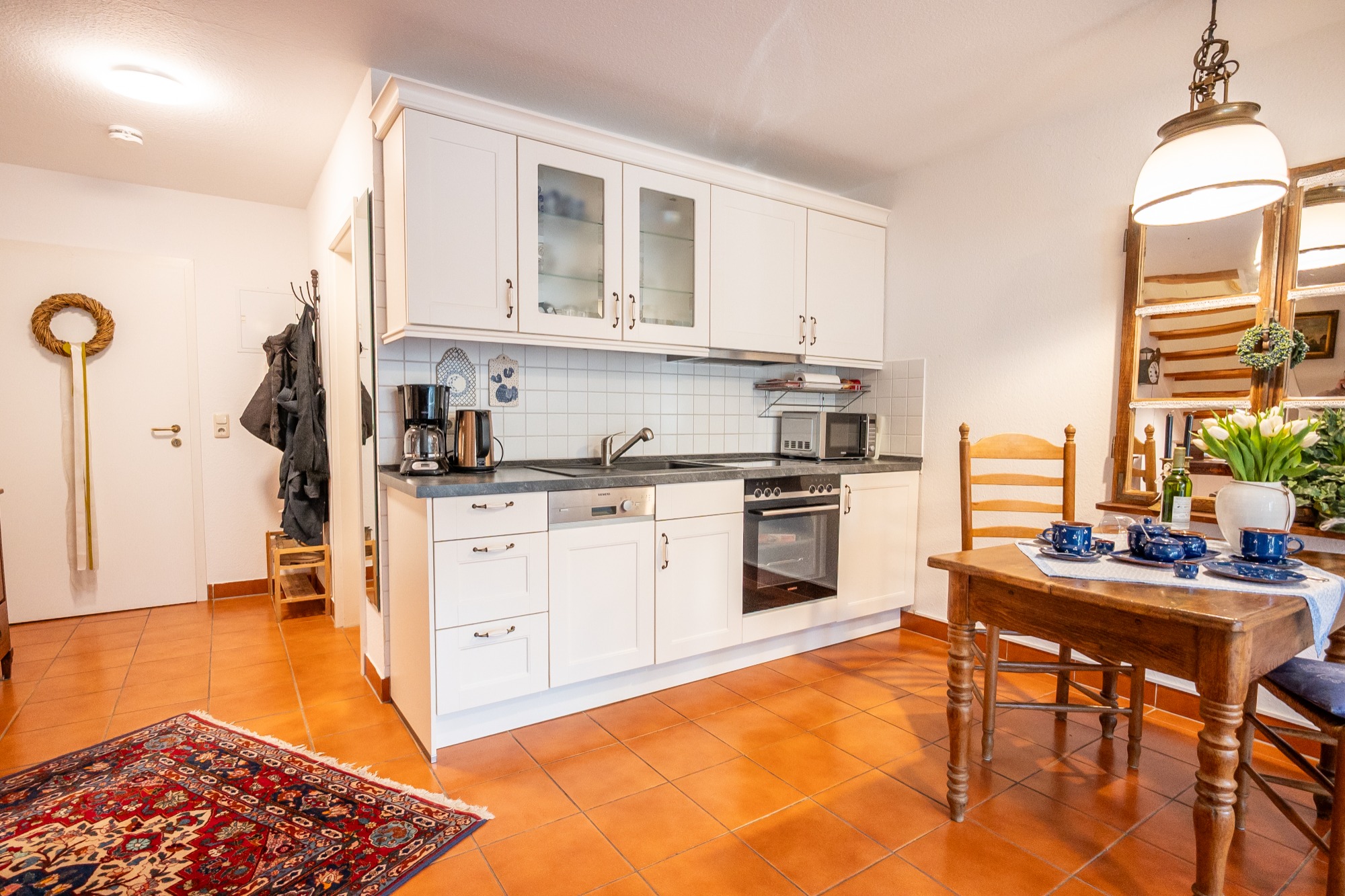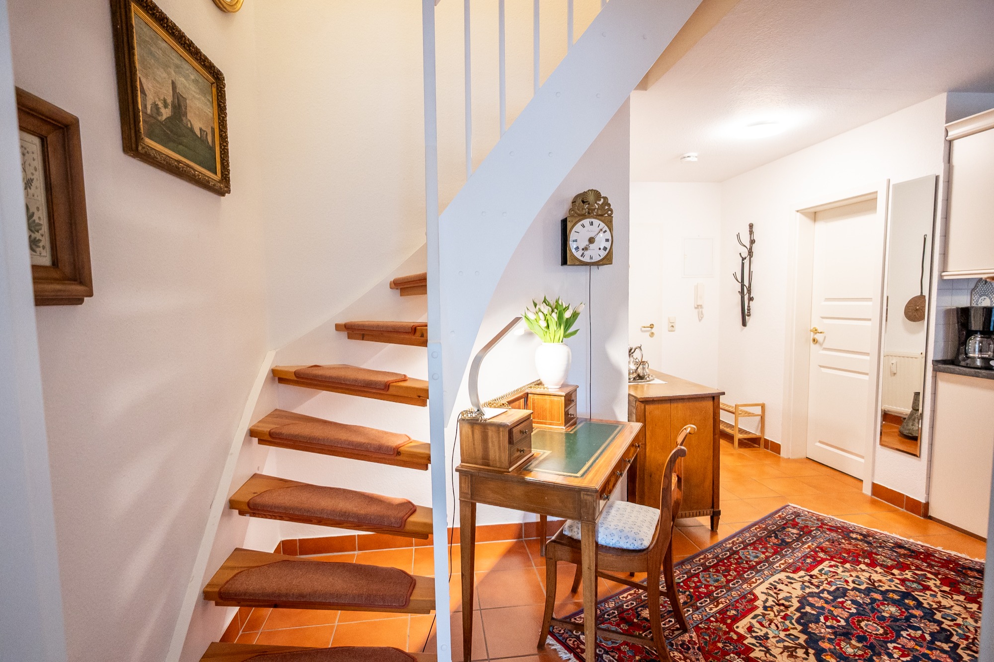 Die 68 qm große Maisonettewohnung erstreckt sich über zwei Etagen und verbindet stilvolles Wohnen mit hohem Komfort. Hochwertige Antiquitäten, ausgewählte Ölgemälde und eine durchdachte Raumaufteilung schaffen eine besondere Atmosphäre, ideal für Gäste, die Ruhe, Qualität und Individualität schätzen.