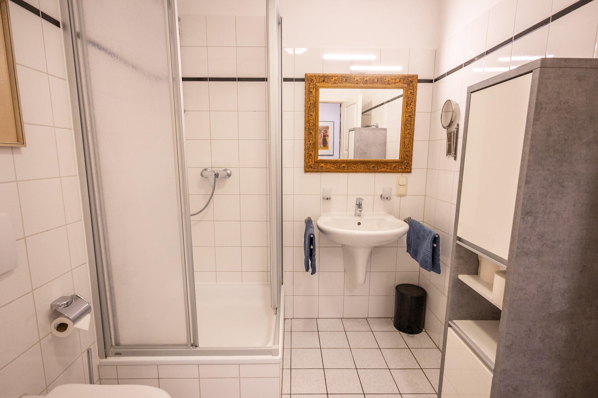 - Badezimmer mit Dusche, Waschbecken und Waschmaschine