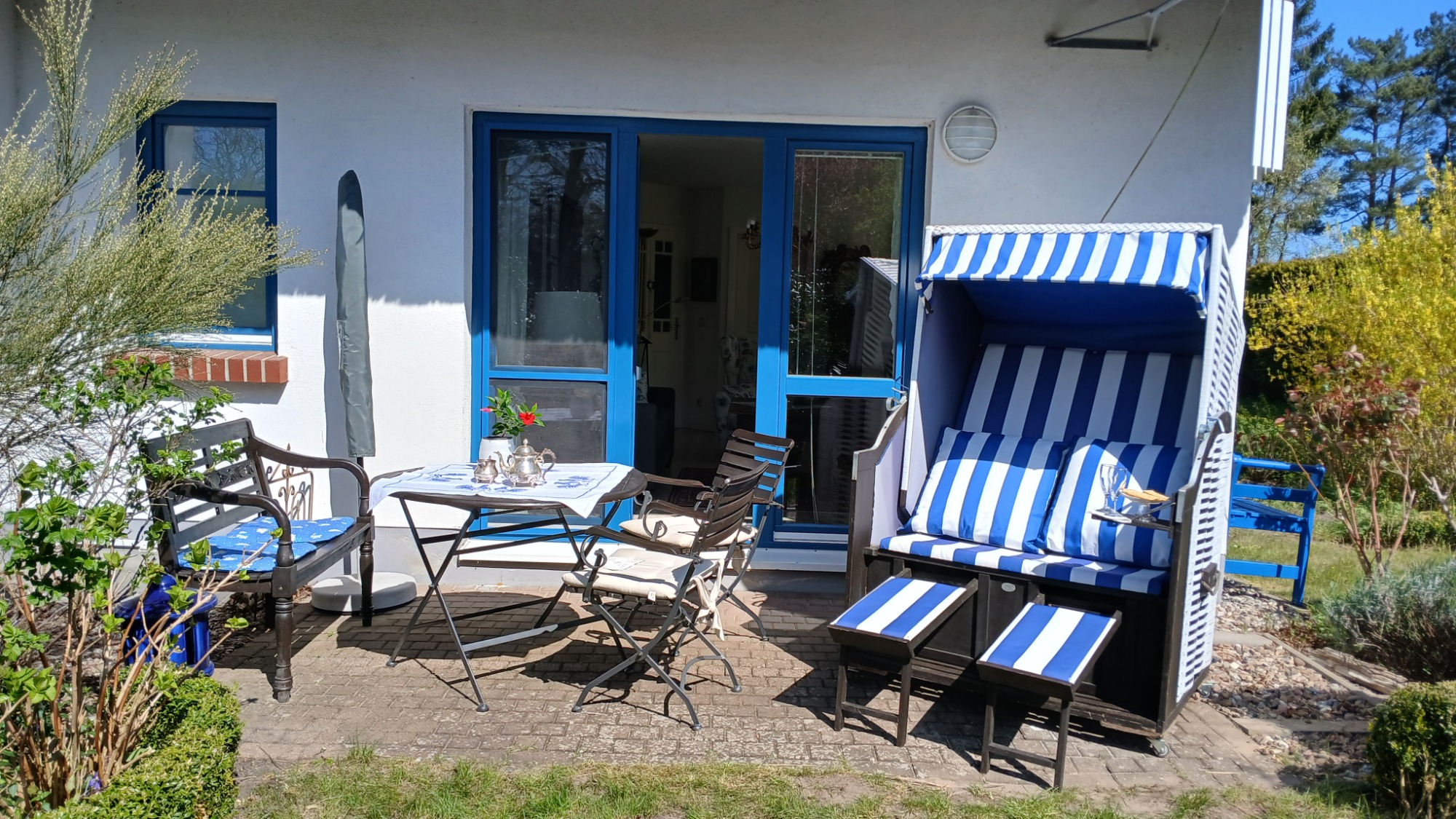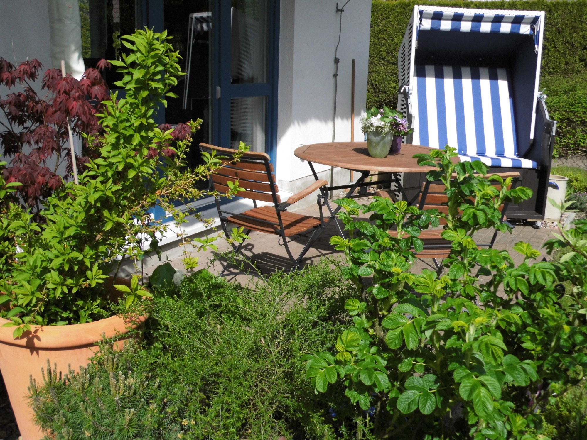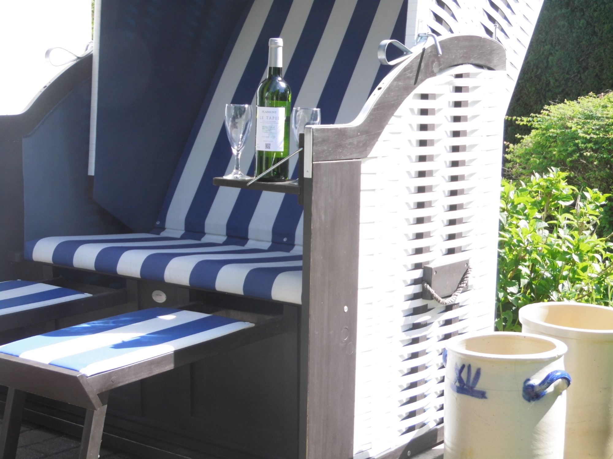 - Terrasse mit Strandkorb, Gartenmöbeln und Sonnenschirm
