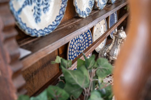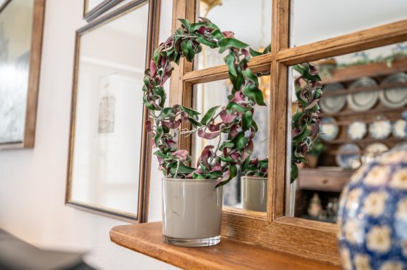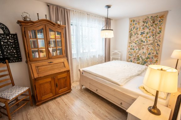 Auch in den weiteren Räumen setzt sich dieser Charakter fort: Ein antiker Schreibtisch im Schlafzimmer, ein Eichenbrotschrank im Flur sowie weitere originale Fundstücke wie eine Comptoise-Uhr oder traditionelle Arbeitsgeräte erzählen von vergangener Zeit und machen die Wildrose zu einem Ort mit Seele.