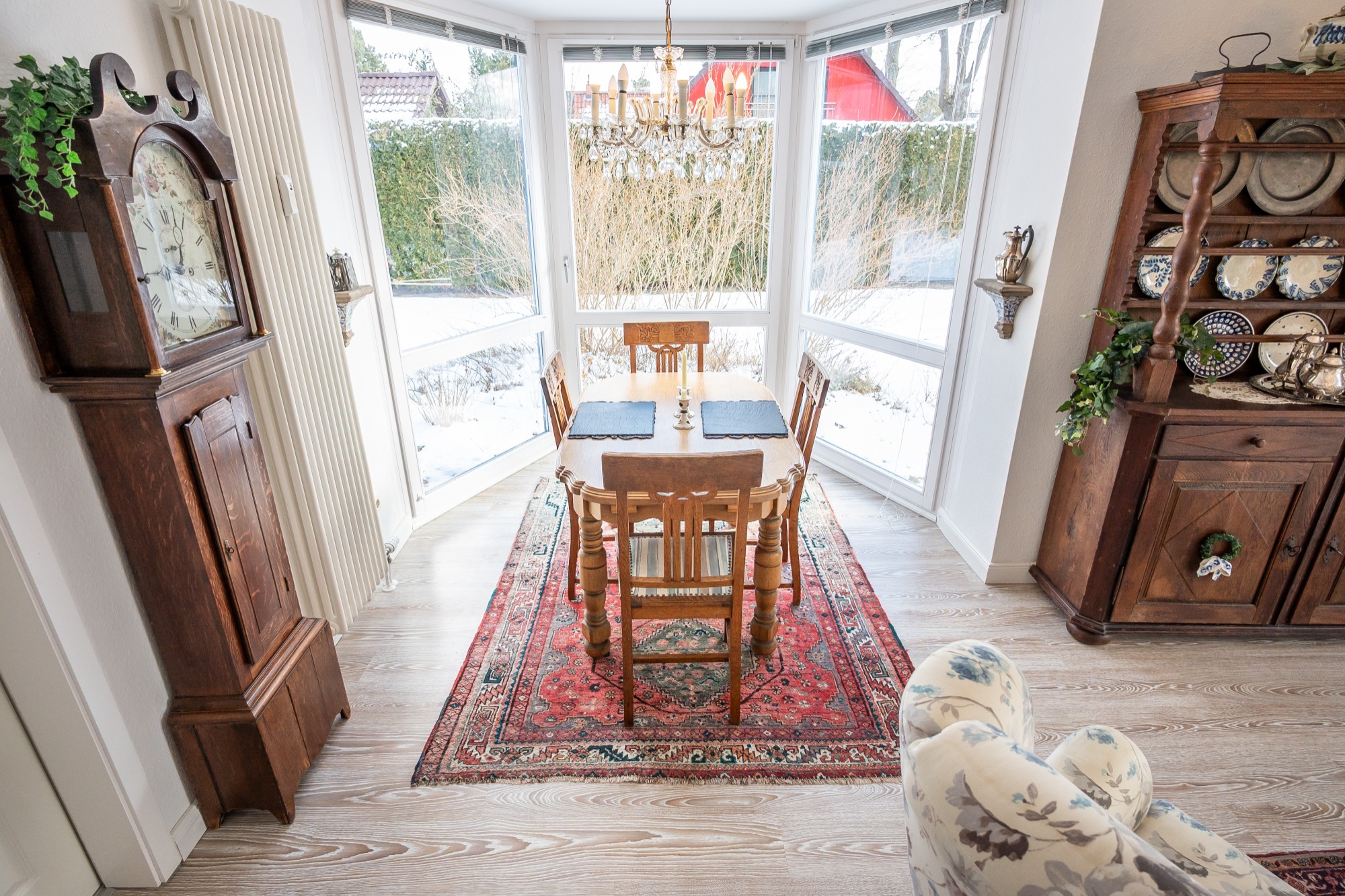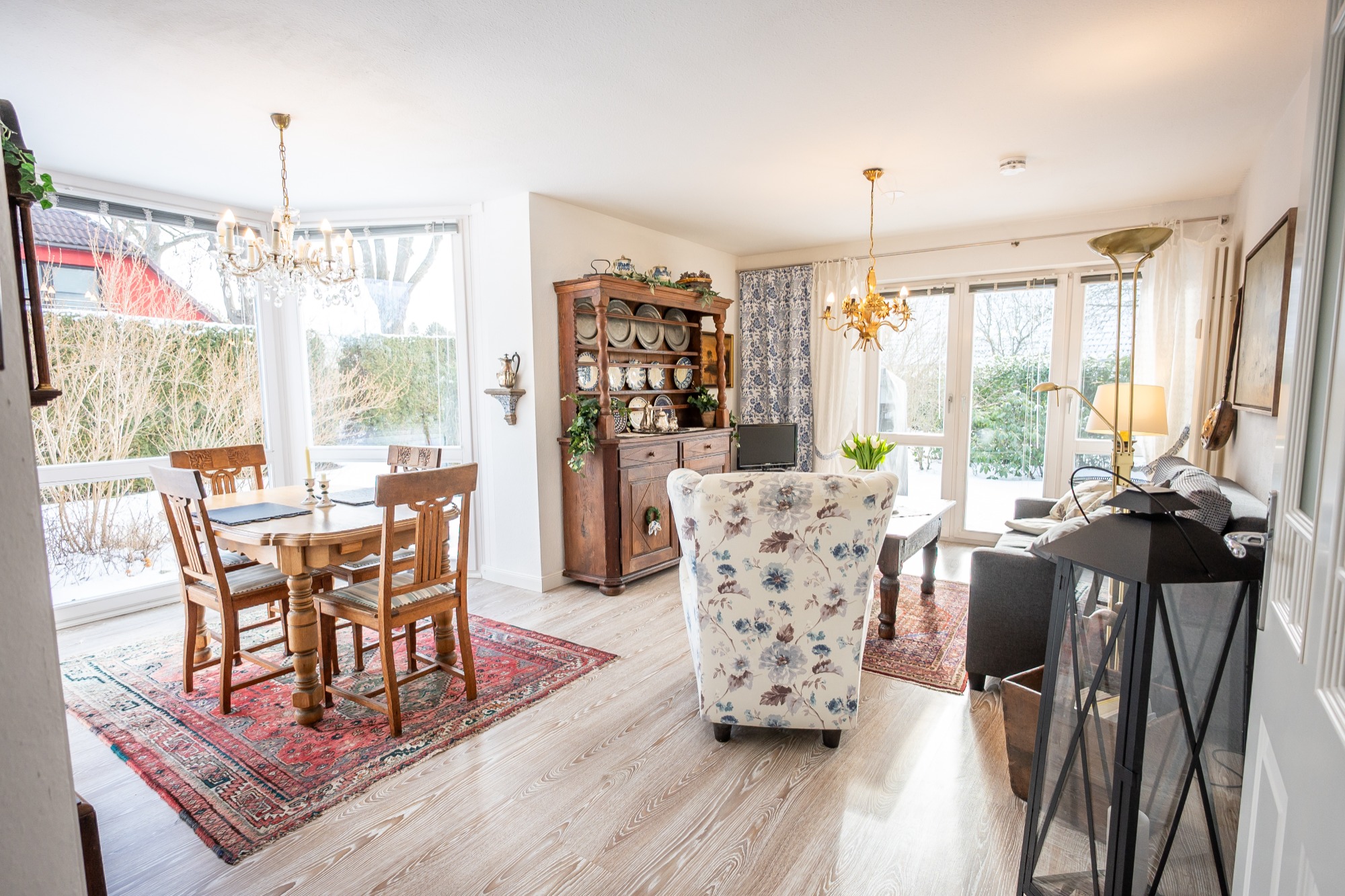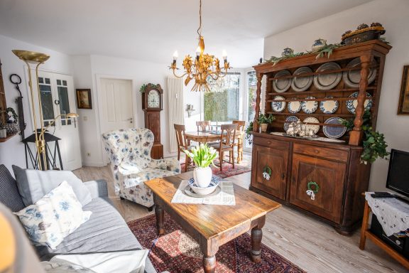 - Großzügiges Wohn- und Esszimmer mit Sofa, Sesseln, Esstisch und liebevoller, teils antiker Einrichtung
