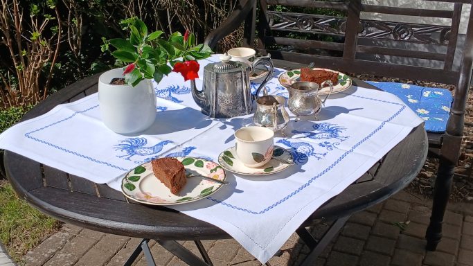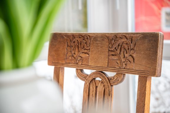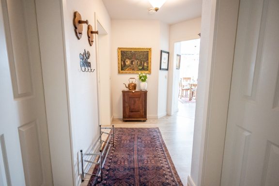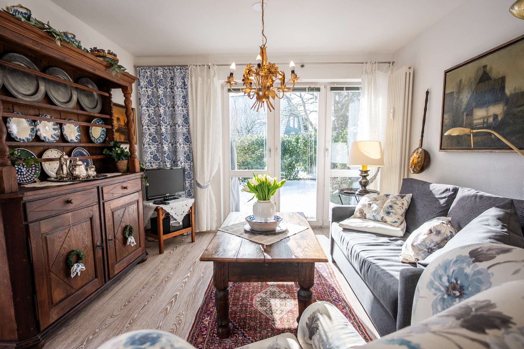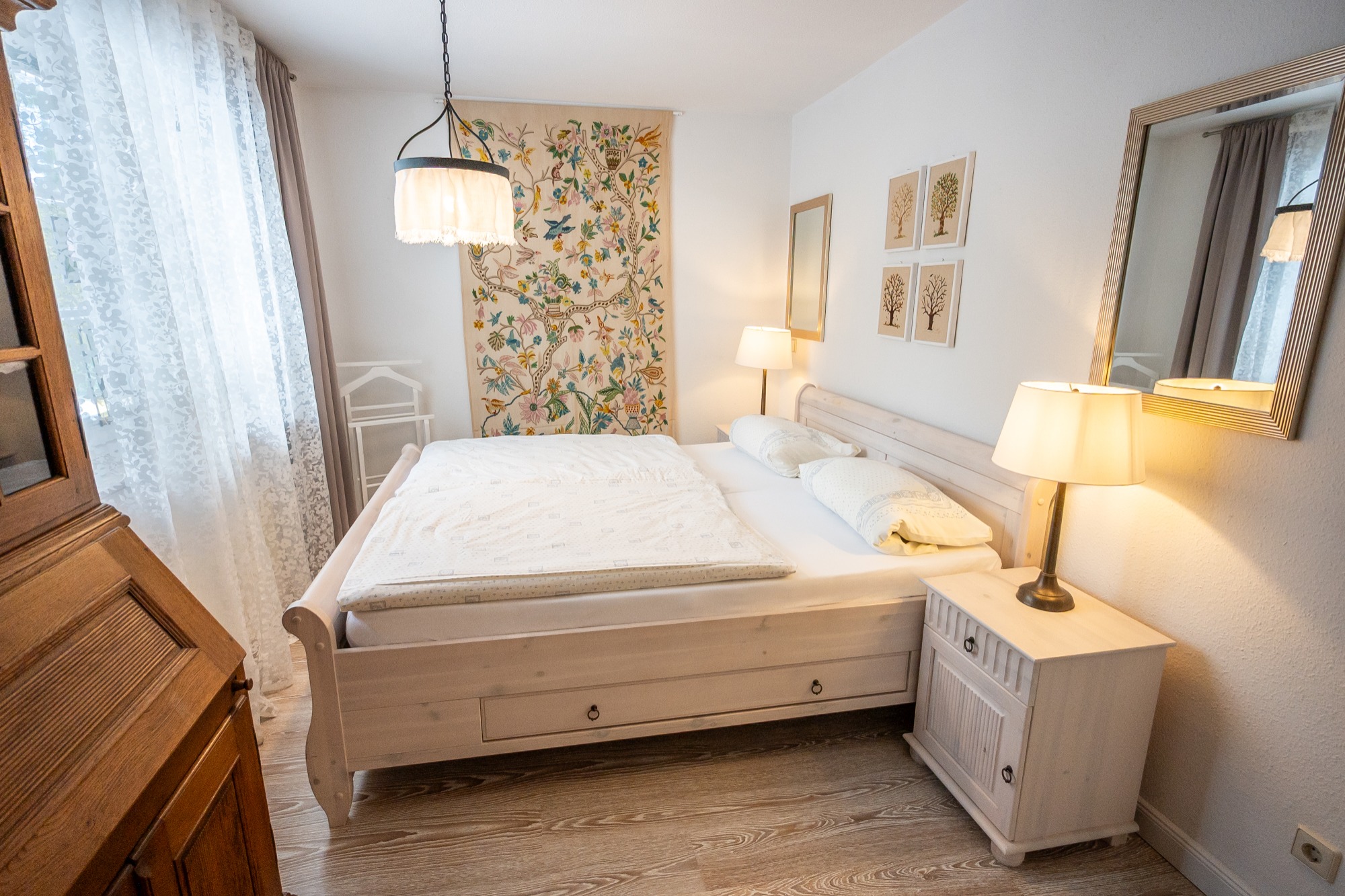 Die Ferienwohnung Wildrose erzählt ihre ganz eigene Geschichte. Liebevoll ausgewählte, teilweise antike Möbelstücke verleihen den Räumen eine warme, besondere Atmosphäre, die weit über eine klassische Ferienwohnung hinausgeht. Im Wohnzimmer zieht ein historischer Kannenstock aus Eichenholz aus dem 19. Jahrhundert die Blicke auf sich, ergänzt durch ein großes Spiegelfenster aus einem alten Bauernhaus und ein stimmungsvolles Ölgemälde mit Darßer Motiven.