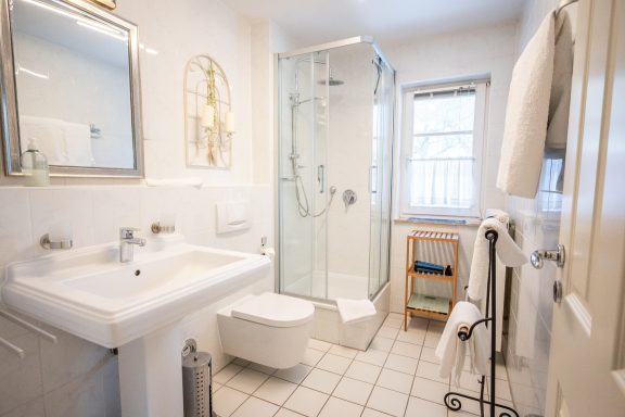 - Badezimmer mit Dusche, Föhn, Kosmetikspiegel und Fenster