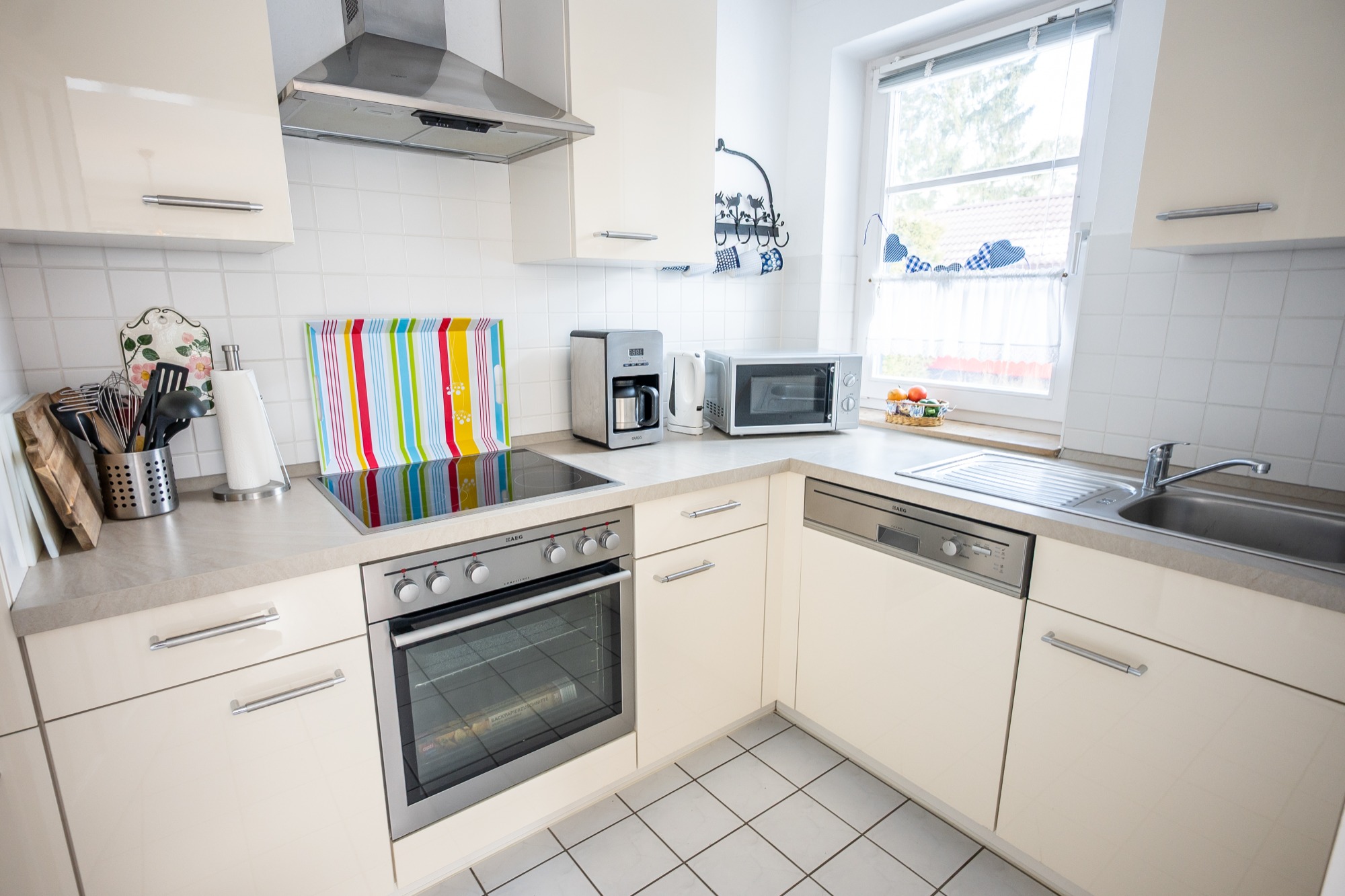 - Voll ausgestattete Küche mit Ceranfeld, Backofen, Geschirrspüler, Mikrowelle, Kühlschrank mit Gefrierfach, Toaster, Wasserkocher, Mixer und Filterkaffeemaschine mit Thermoskanne