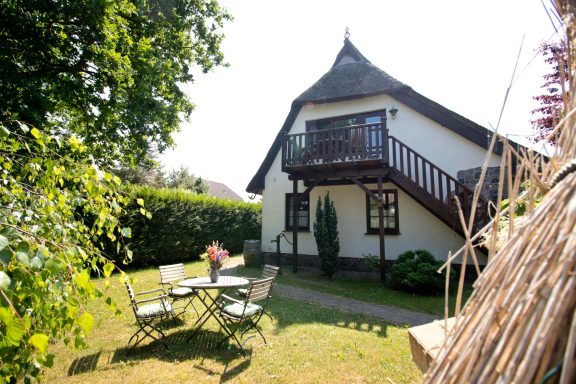 Die gemütliche Dachgeschosswohnung liegt im ersten Stock direkt unter dem Reetdach und ist über eine separate Außentreppe zu erreichen. Die Ferienwohnung ist für 2 Personen und 1 Aufbettung (nach Anfrage) ausgelegt und umfasst ca. 50 qm Wohnfläche mit Balkon und Terrasse im Garten.
